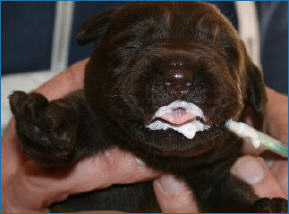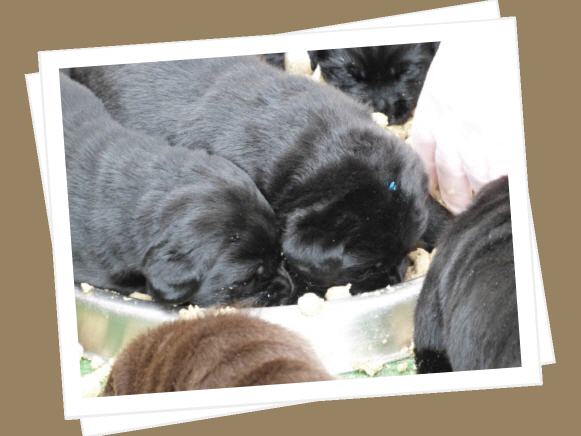 Um sicher zu stellen, dass alle Welpen zunehmen, werden sie von uns in den ersten 14 Tagen 2 x täglich gewogen. Danach wiegen wir die Welpen - bis zur vierten Woche - 1 x täglich und später nur noch alle 2 Tage.