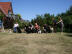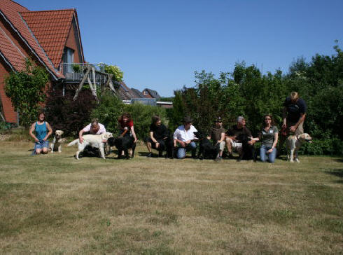 Wir hatten zu um 14:00 Uhr eingeladen und so nach und nach trudelten alle Frauchen, Herrchen, Kinder und Welpen bei uns ein. Eigentlich wollten wir unser erstes Wiedersehen mit einem gemeinsamen Spaziergang beginnen, aber bei Temperaturen um die 30° C und keinem Windzug hatten wir uns schnell dazu entschlossen, lieber ein schattiges Plätzchen zu suchen und der Meute beim herumtollen zuzusehen, dabei wurde natürlich auch eine ganze Menge gefachsimpelt.