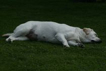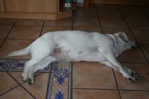 Am 12.06.2011 war es soweit. Nachdem Bluna gegen 6:30 Uhr etwas Fruchtwasser verloren hatte, setzten die Wehen ganz normal ein und wir warteten gespannt auf den ersten Welpen. Leider bemerkten wir aber recht schnell, dass etwas nicht stimmte und so entschlossen wir uns, mit Bluna zum Tierarzt zu fahren. Dort mussten wir feststellen, dass ein sehr großer Welpe verkehrtherum im Geburtskanal feststeckte. Leider konnten wir diesen gelben Rüden nur noch tot holen. Auf den danach angefertigten Röntgenaufnahmen konnte wir keine weiteren Welpen mehr erkennen. Auch bei Bluna hatten wir jetzt das Gefühl, dass sie mit der Geburt abgeschlossen hatte, denn sie legte sich bereits in der Praxis ganz entspannt hin. Wir sind jetzt schon seit einigen Stunden wieder zuhause und zum Glück geht es Bluna den Umständen entsprechend gut. Sie schläft jetzt viel und erholt sich von den Strapazen der Geburt.