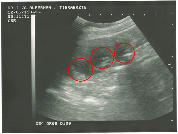 12.05.2011 Ultraschall Bluna In den roten Kreisen kann man die Fruchtkammern mit den Welpen erkennen.