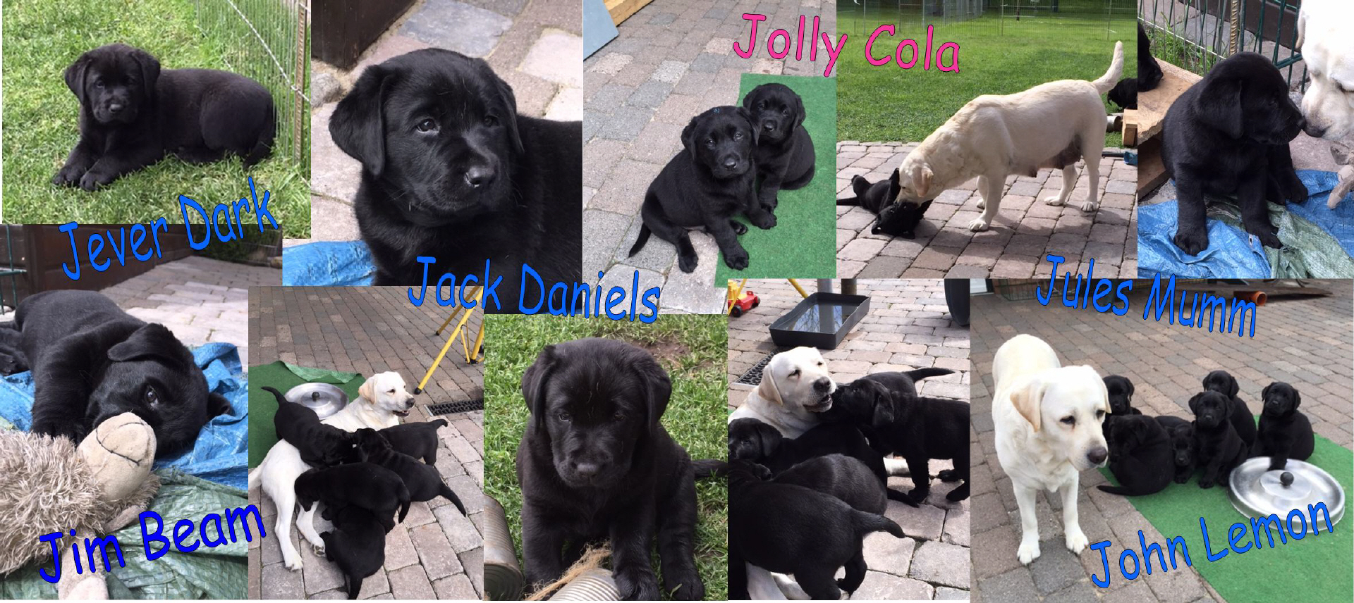 Die Namen der Rüden können wir noch untereinander tauschen und somit steht -bis zum Chippen- auch noch nicht fest, welcher Rüde welchen Zuchtbuchnamen erhält. Nur der Name der Hündin ist mit "Jolly Cola" bereits festgelegt, denn in diesem Wurf wurde ja nur eine kleine schwarze Hündin geboren.