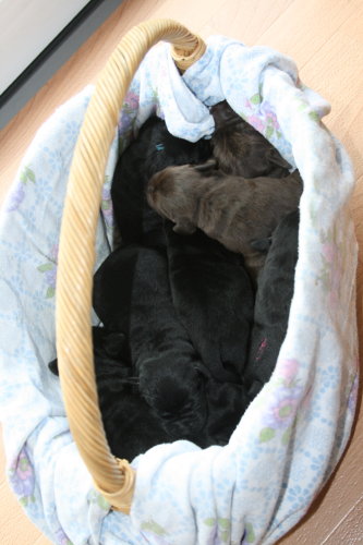 Nun war Eile geboten und so machte ich mich wieder auf den Heimweg.Zuhause angekommen, wurde schnell der Welpe versorgt, bevor er zu seiner Mutter und seinen Geschwistern in die Wurfkiste durfte.