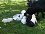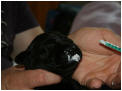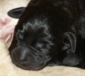 Als der erste Welpe - nach den ersten Presswehen - sehr schnell das Licht der Welt erblickt hatte, ließ der zweite Welpe lange auf sich warten. Erst zwei Stunden später durften wir einen kleinen schwarzen Rüden begrüßen.