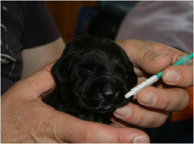 Am Dienstagmorgen, 15.07.2014, um 5:50 Uhr war es soweit und die erste kleine schwarze Hündin wurde geboren.