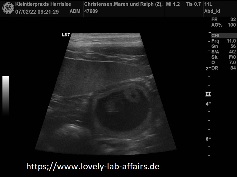 Wir freuen uns mitteilen zu können, dass wir um den 11. März 2022 einen Wurf mit braunen und schwarzen Welpen erwarten. Die Ultraschalluntersuchung am 07. 02. 2022 hat uns mehrere Fruchthüllen / Welpen bei *Lillet* erkennen lassen.