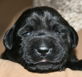 Die Namen der Rüden können wir noch untereinander tauschen und somit steht -bis zum Chippen- auch noch nicht fest, welcher Rüde welchen Zuchtbuchnamen erhält. Nur der Name der Hündin ist mit "Jolly Cola" bereits festgelegt, denn in diesem Wurf wurde ja nur eine kleine schwarze Hündin geboren.