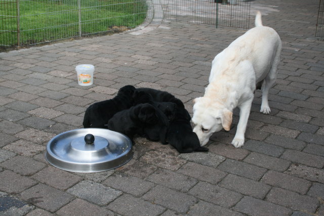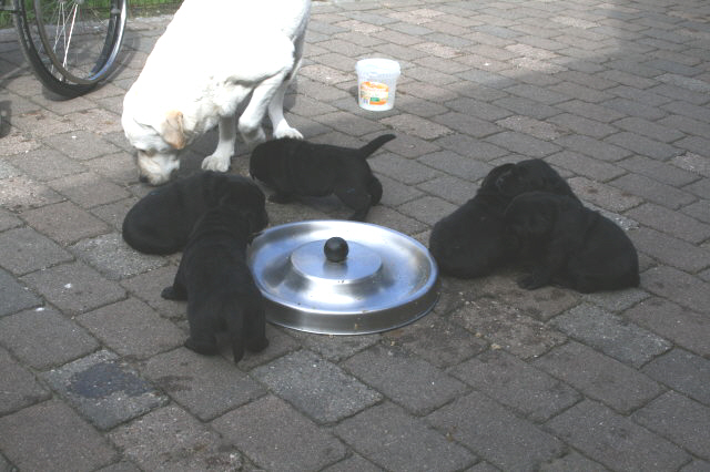Um die Welpen an feste Nahrung zu gewöhnen, haben wir die "Kleinen" in den letzten Tagen schon einge Male aus der Hand ins Mäulchen gefüttert. Heute ist nun der große Tag gekommen und die Welpen sollen es alleine probieren...