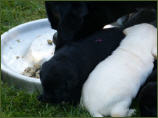 Als der erste Welpe - nach den ersten Presswehen - sehr schnell das Licht der Welt erblickt hatte, ließ der zweite Welpe lange auf sich warten. Erst zwei Stunden später durften wir einen kleinen schwarzen Rüden begrüßen.
